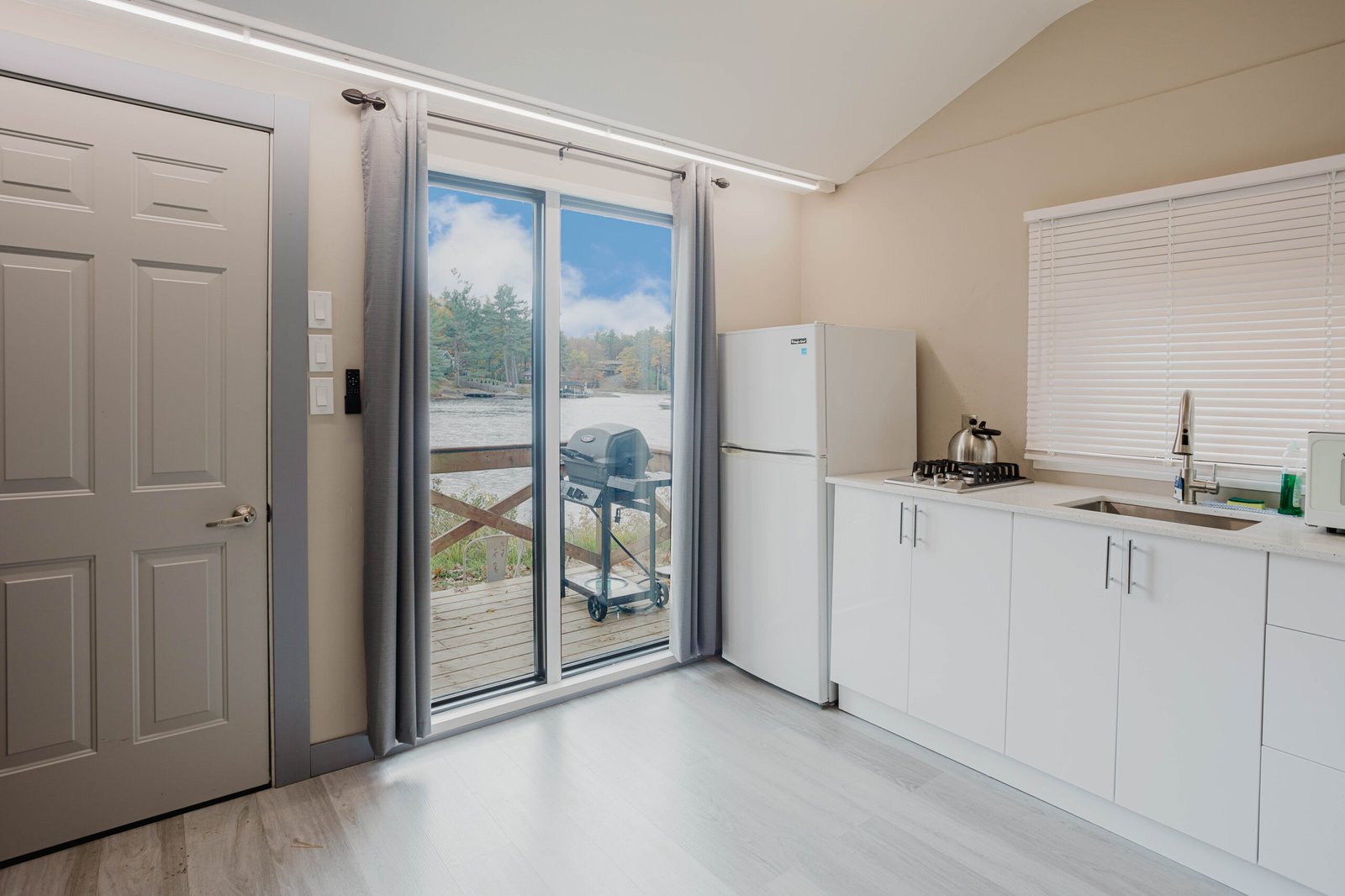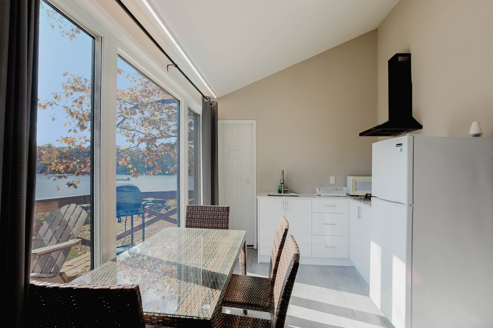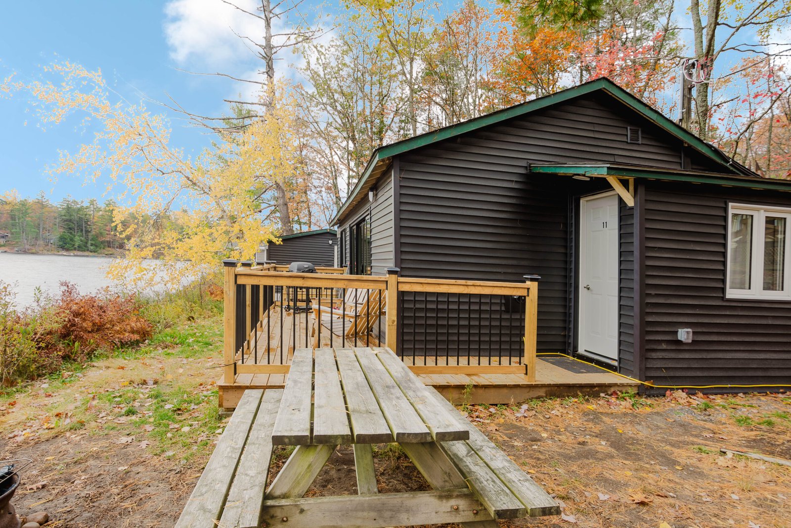 A waterfront studio cottage #6 offers you summer sunrises with morning coffee in lounge chairs on the deck and wonderful views of the Muskoka all day long.