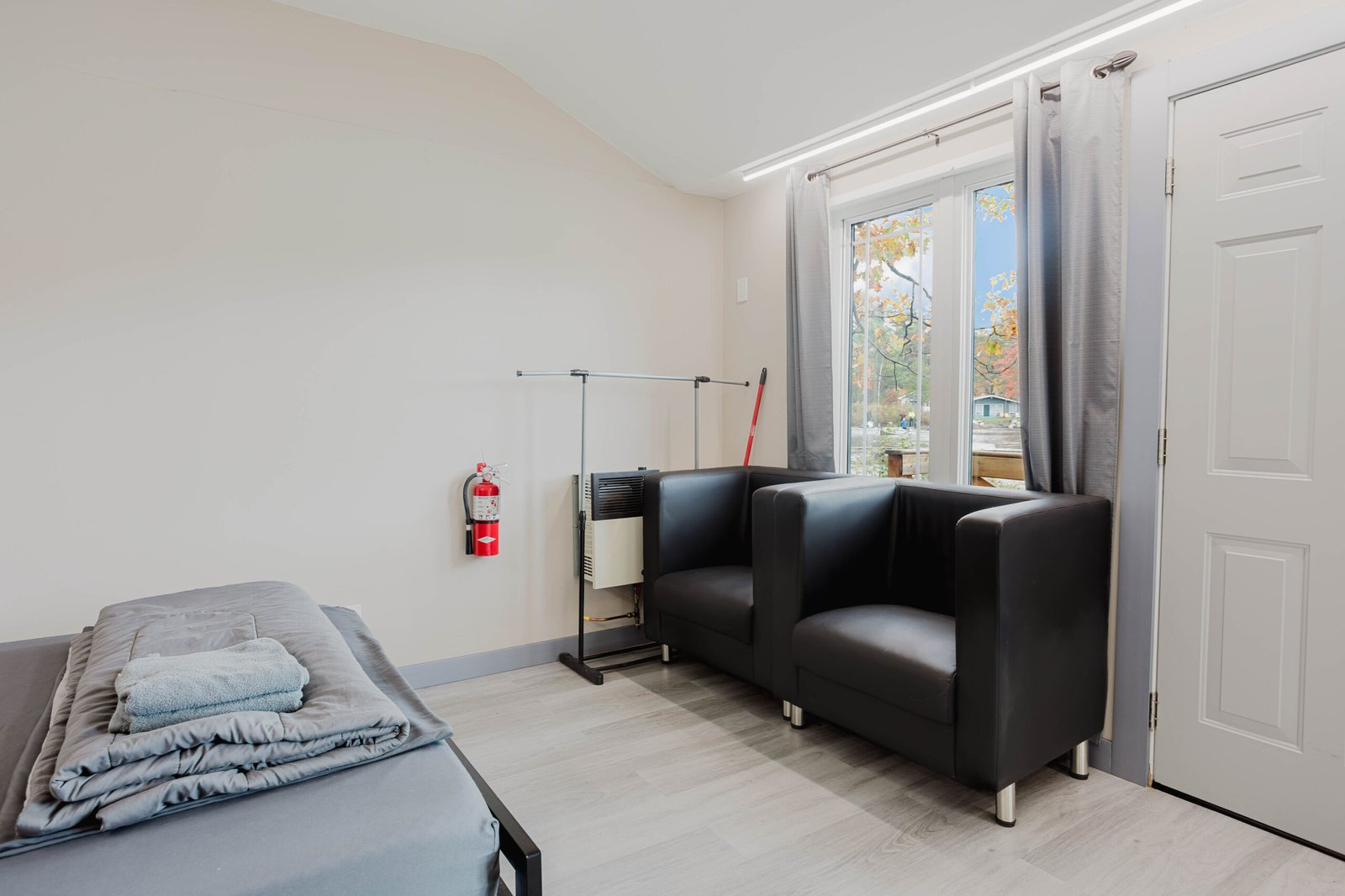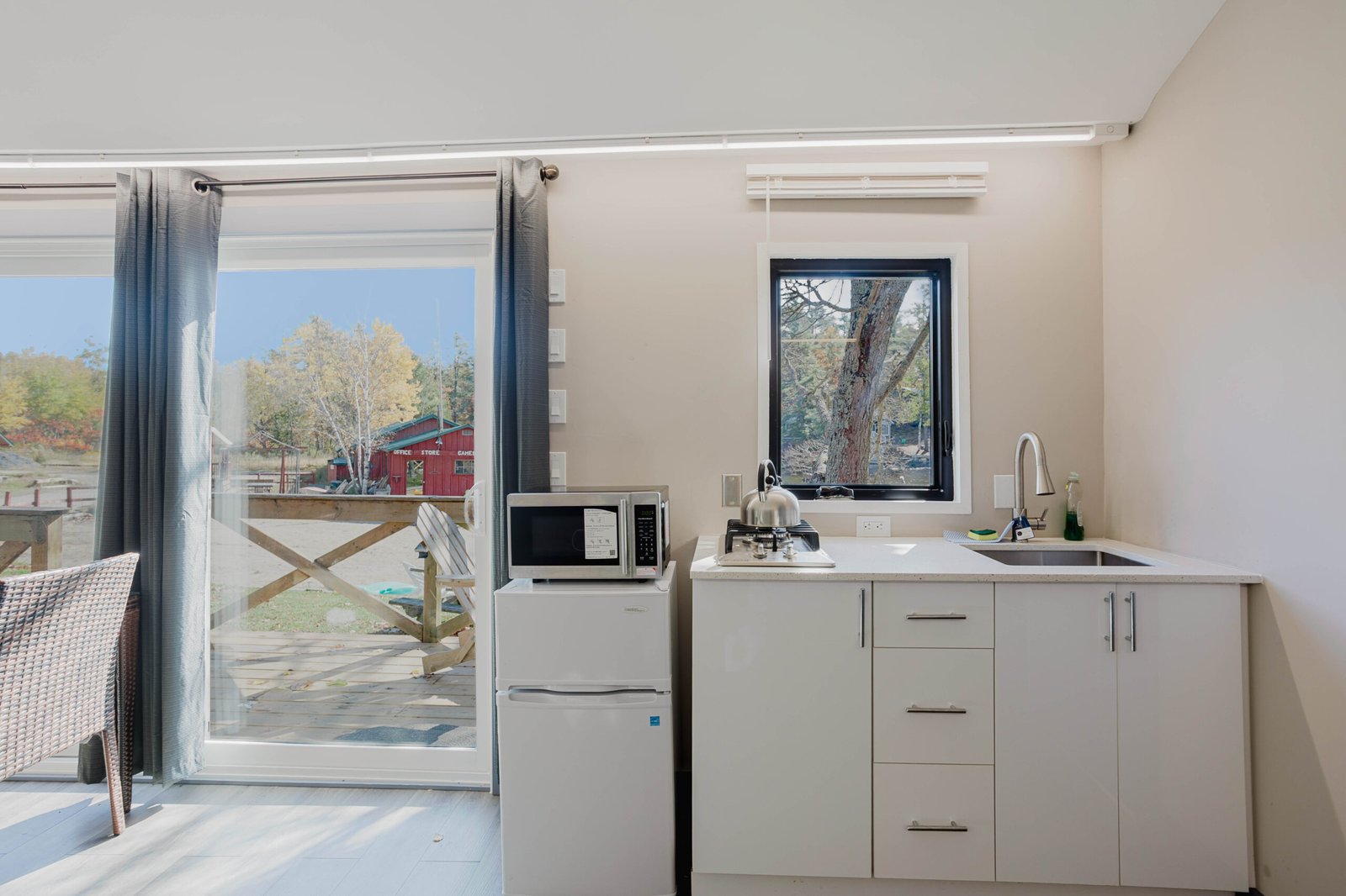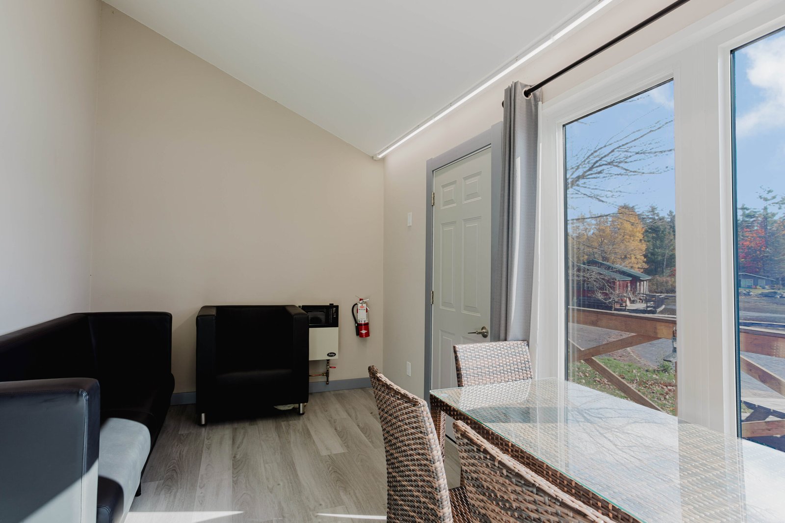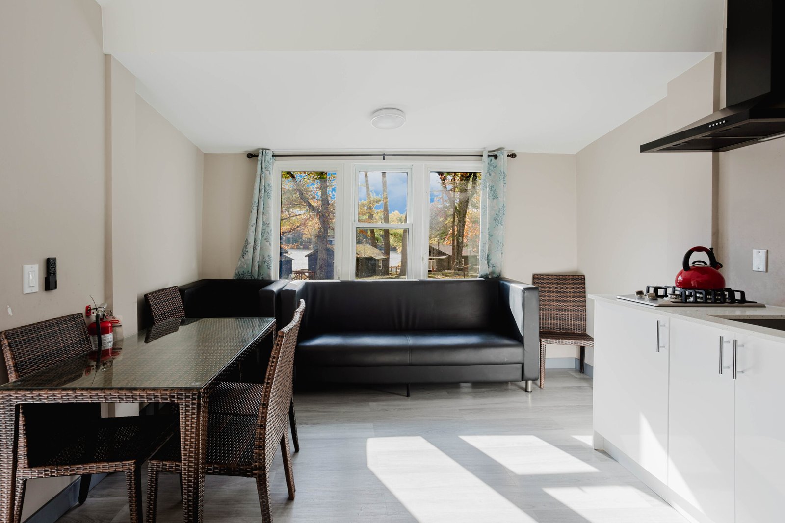 A waterfront studio cottage #6 offers you summer sunrises with morning coffee in lounge chairs on the deck and wonderful views of the Muskoka all day long.