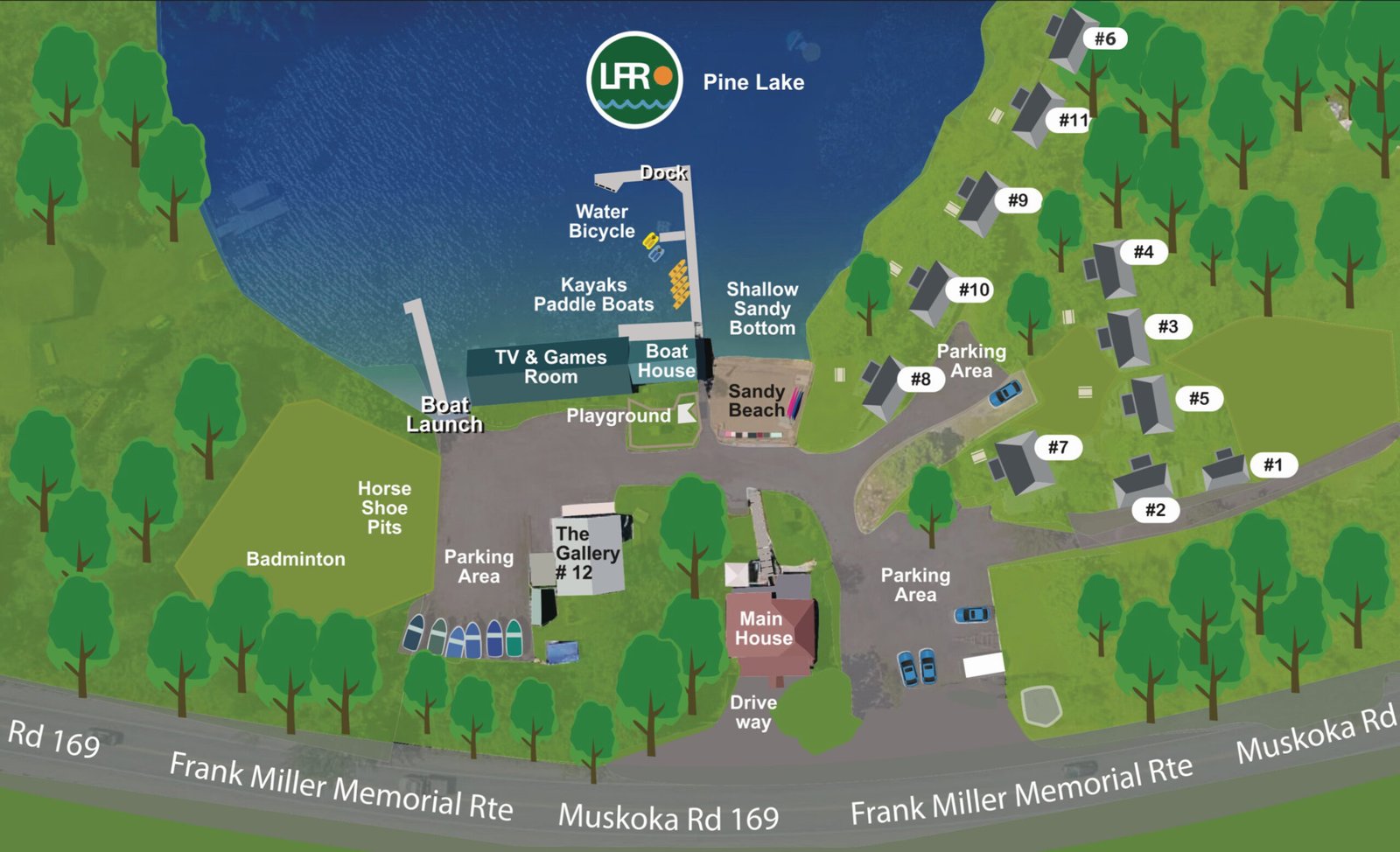 Situated in a quiet bay on Pine Lake just six kilometers west of Gravenhurst on Muskoka District Rd 169. Pine Lake Cottages offers a relaxing vacation for the whole family. The safe, sandy beach is ideal for children of all ages. Paddle boats, canoes and kayaks are provided at no extra charge for guest use. Explore the six mile long lake or fish for small and large mouth bass.